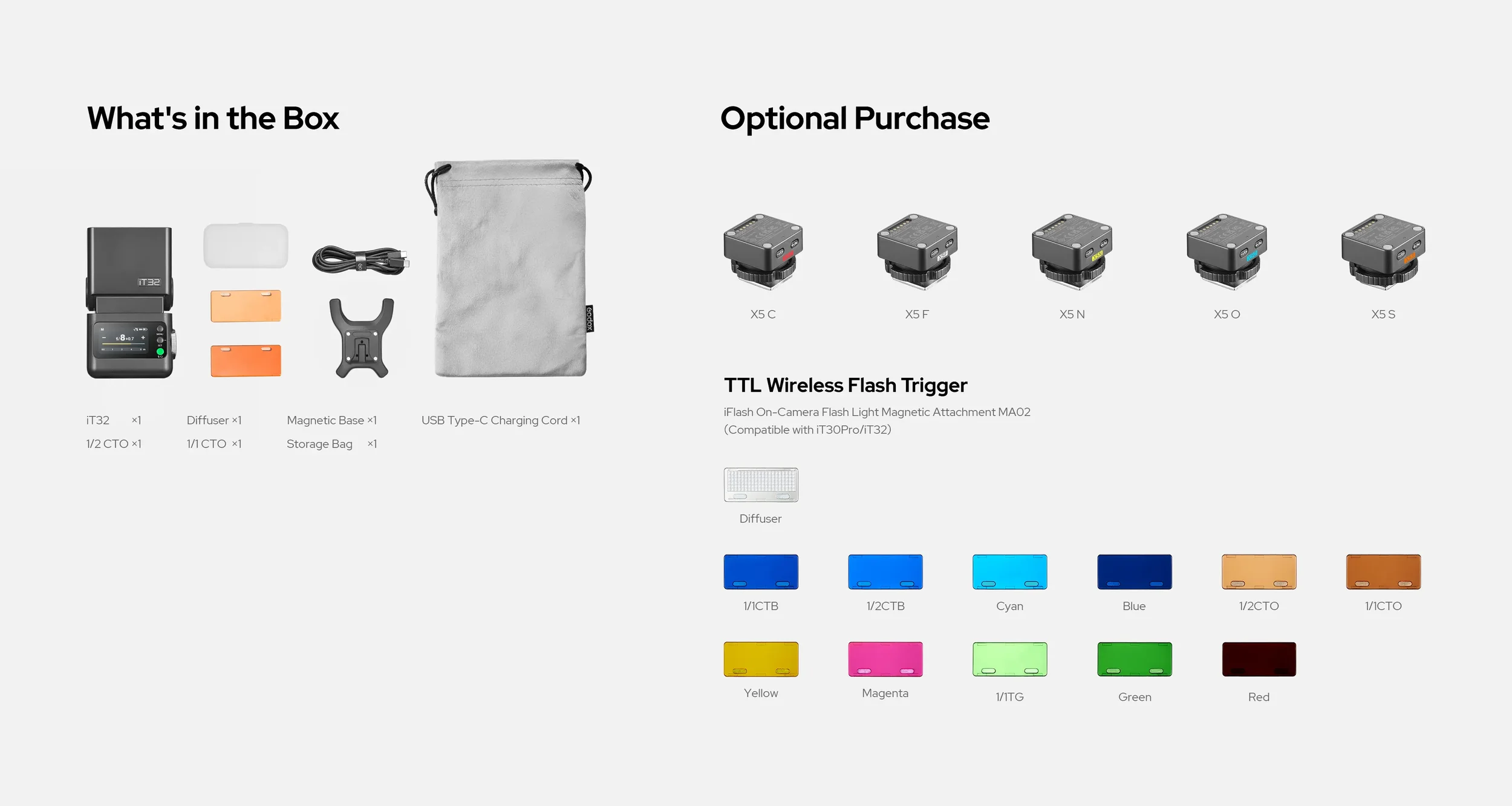 Together, the iT32 and X5 function as a master unit, controlling multiple Godox flashes simultaneously. The system integrates seamlessly with the broader Godox 2.4GHz Wireless X System ecosystem, enabling complex multi-light setups with minimal hassle.